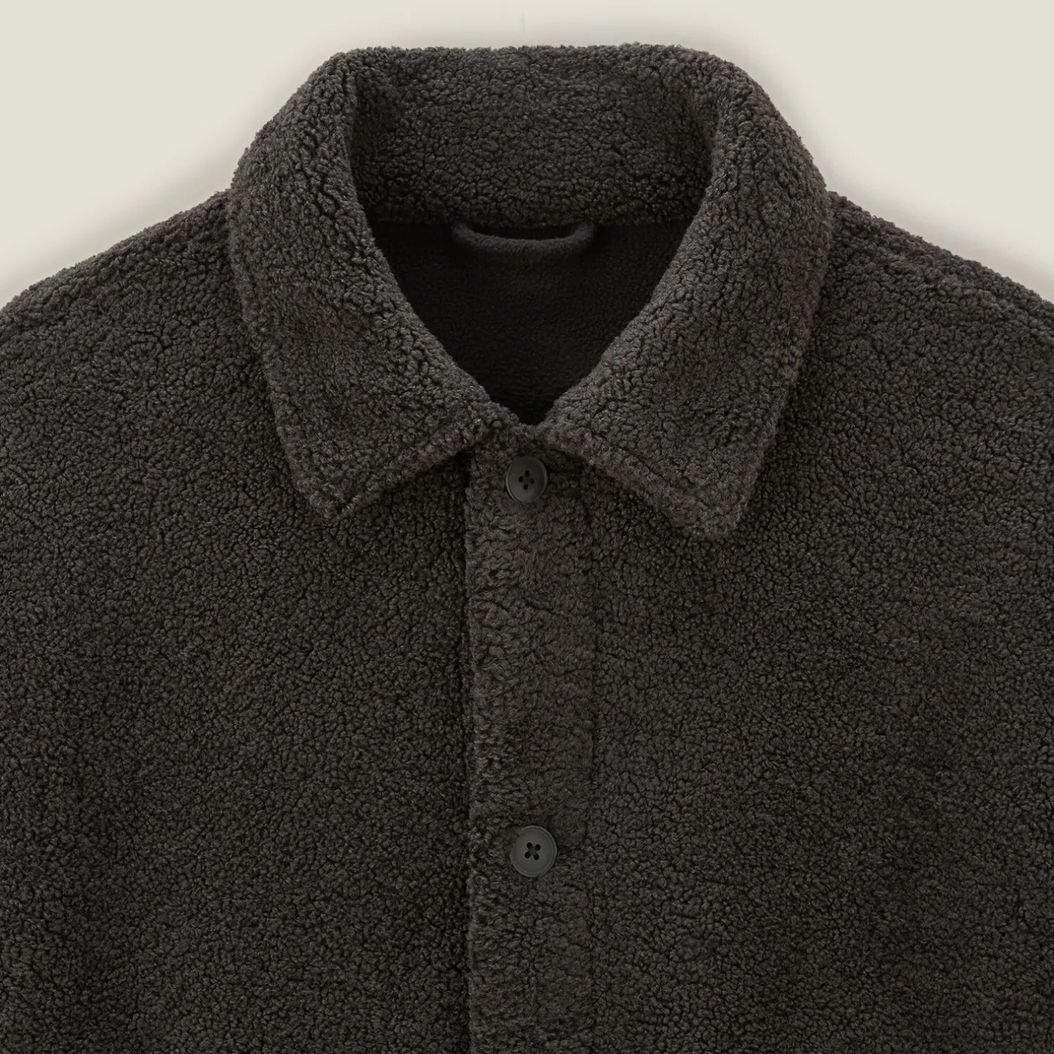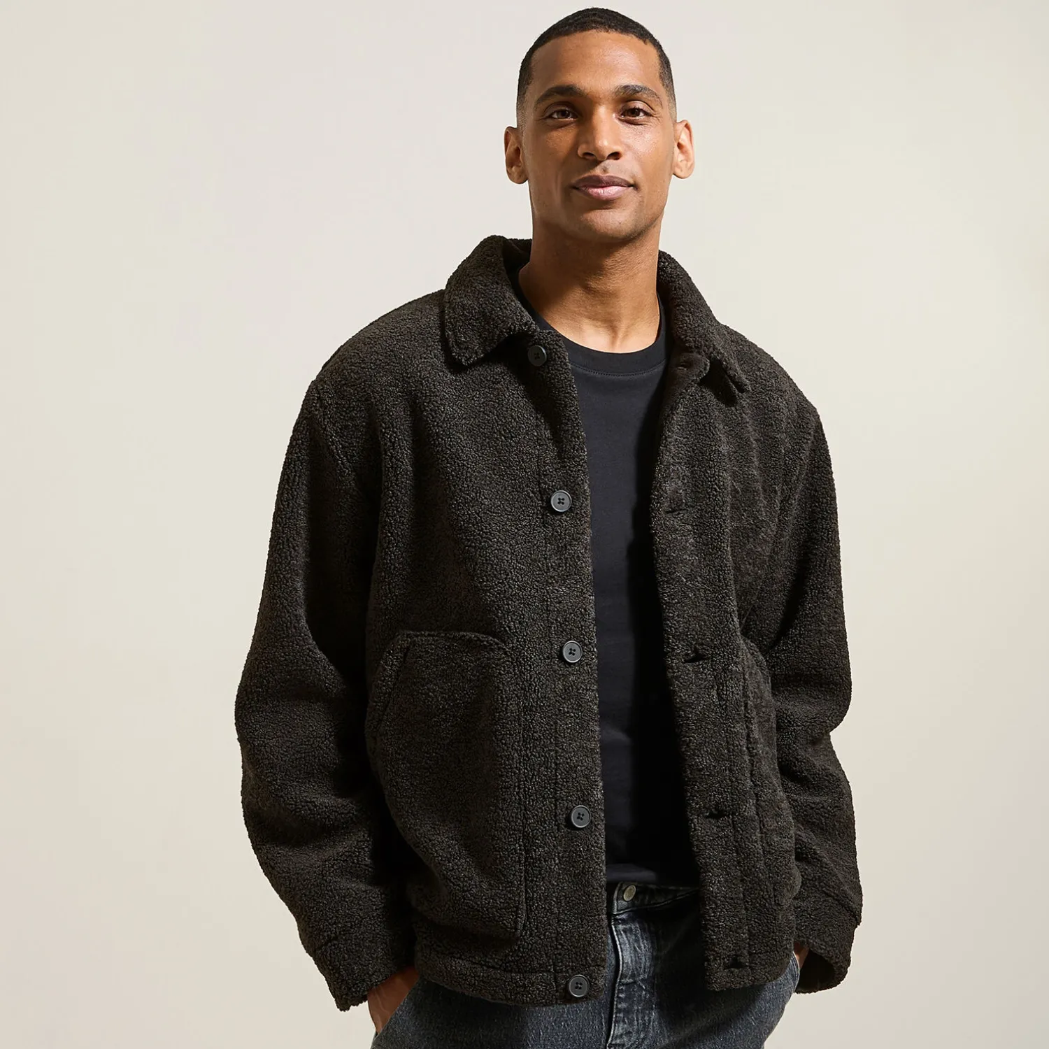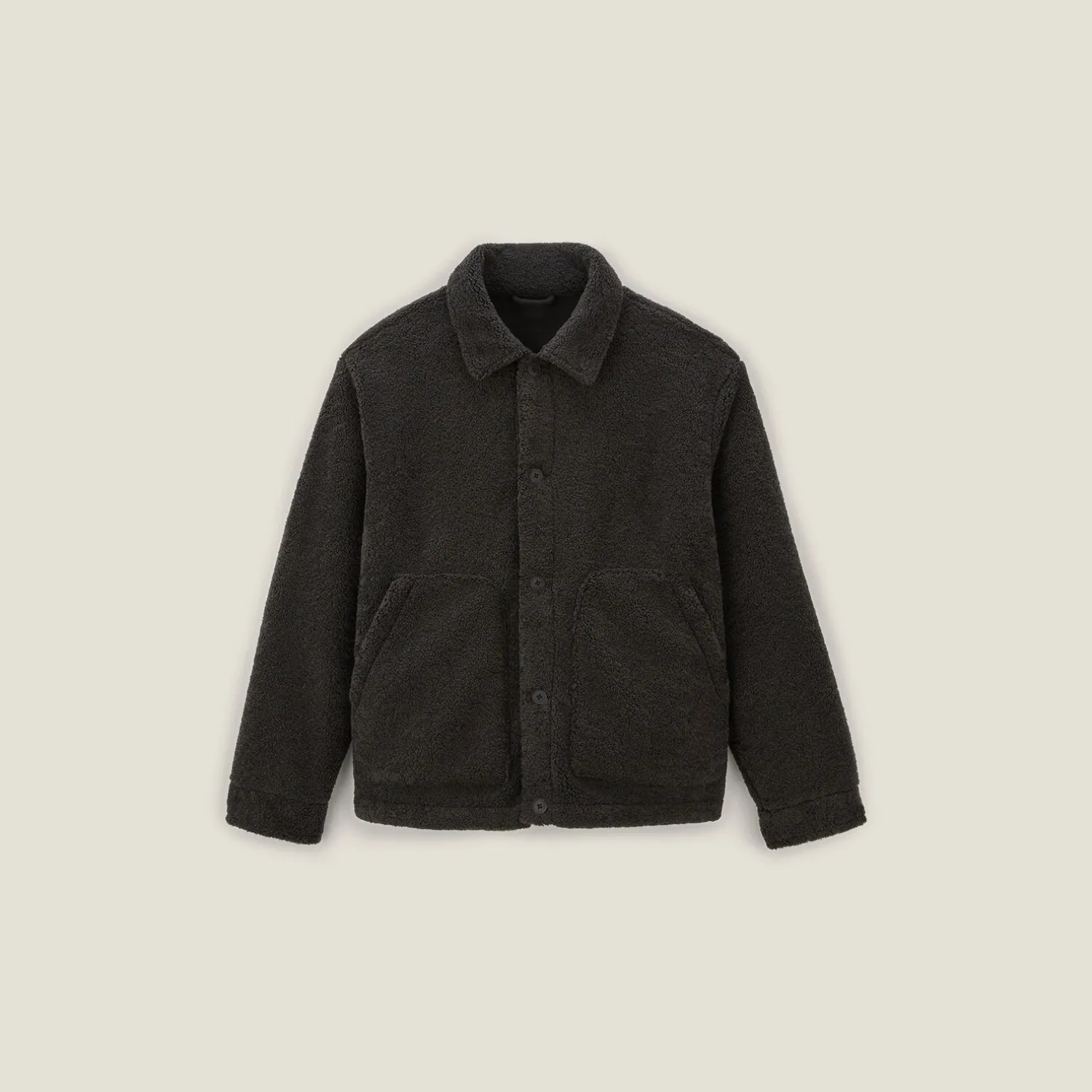 Ce blouson en sherpa à col chemise est idéal pour un look décontracté et tendance. Avec sa fermeture boutonnée et ses deux poches plaquées sur le devant, il allie style et praticité.