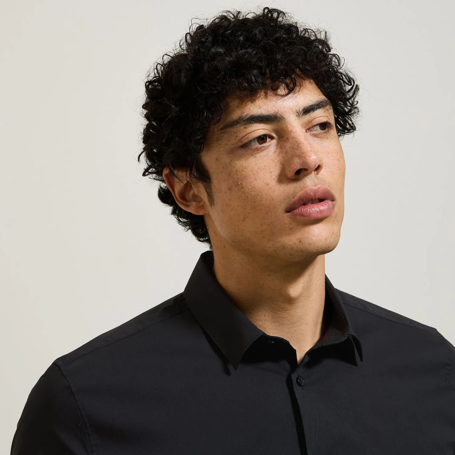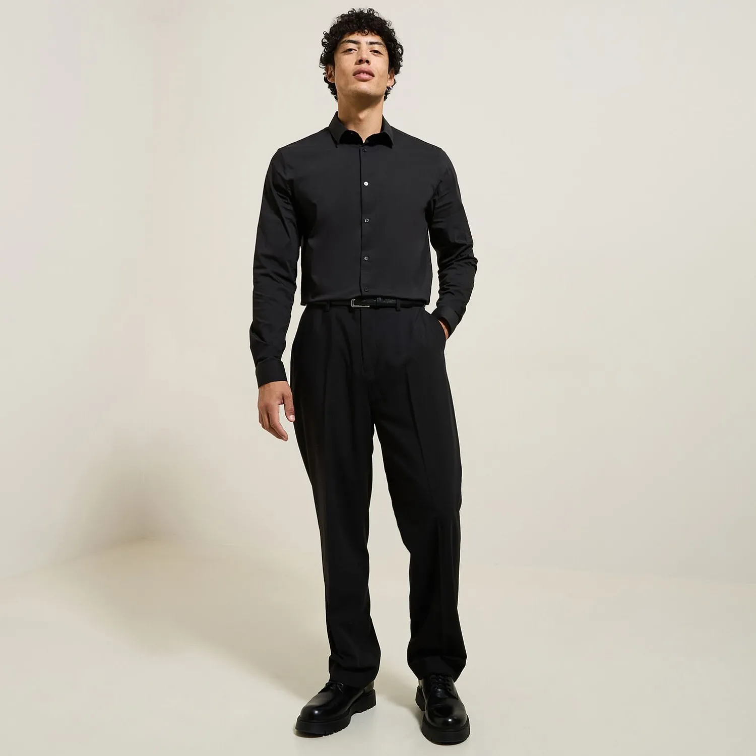 Cette chemise, unie à manches longues, s’associe aisément avec un chino ou un pantalon de costume.