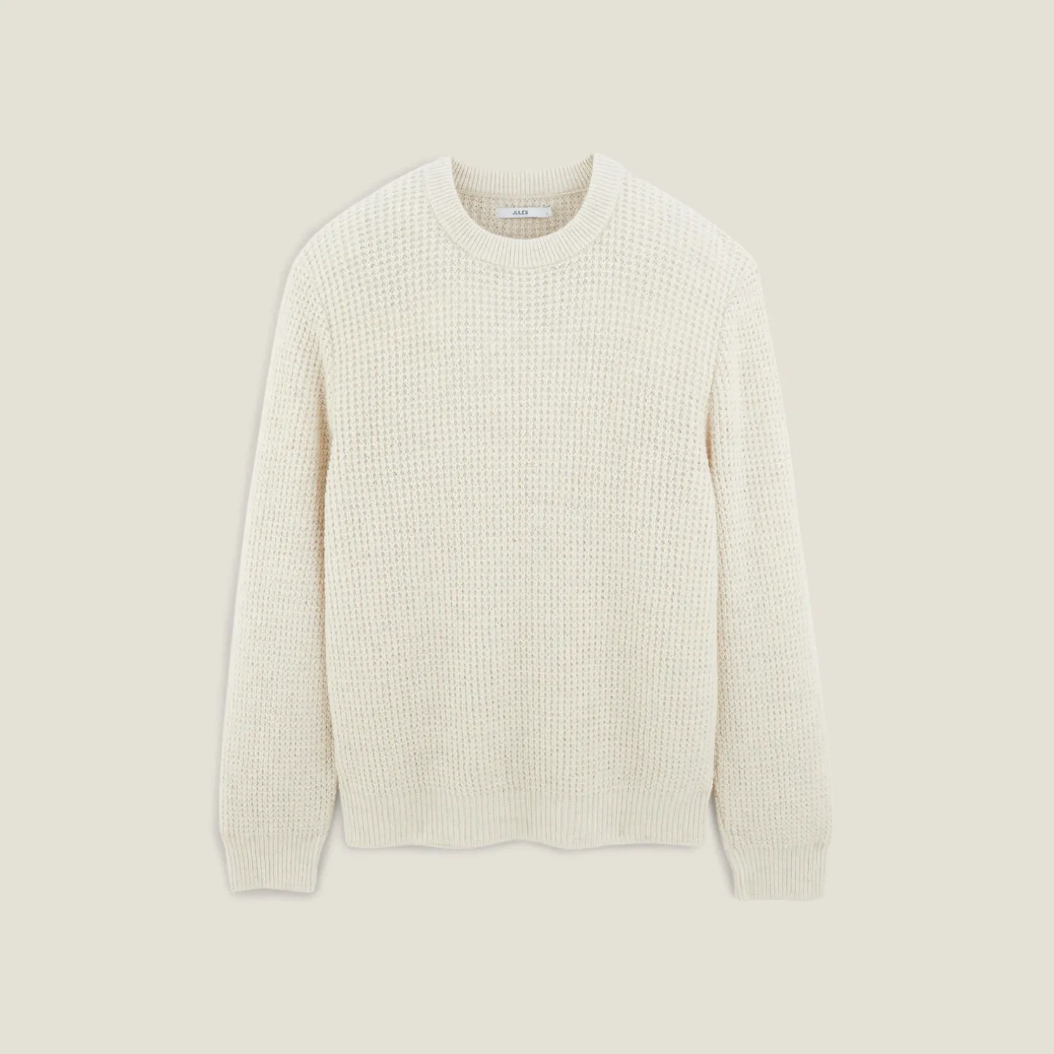 Ce pull à la texture gaufrée se marie parfaitement avec un jean brut pour un look décontracté. Pour une allure plus habillée, on peut l’associer à un pantalon chino et des derbies.