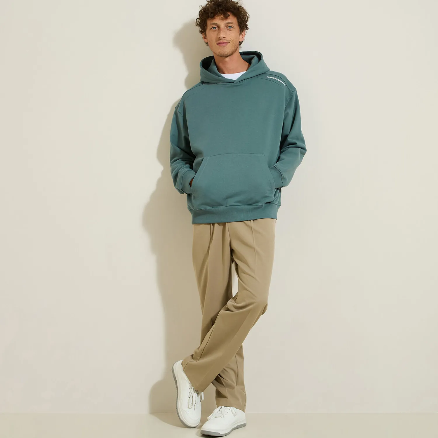 Ce sweat à capuche oversize imprimé au dos et sur l’épaule apporte une touche tendance à vos tenues décontractées. Il s’accorde parfaitement avec un jean clair et des baskets blanches pour un look urbain affirmé.
