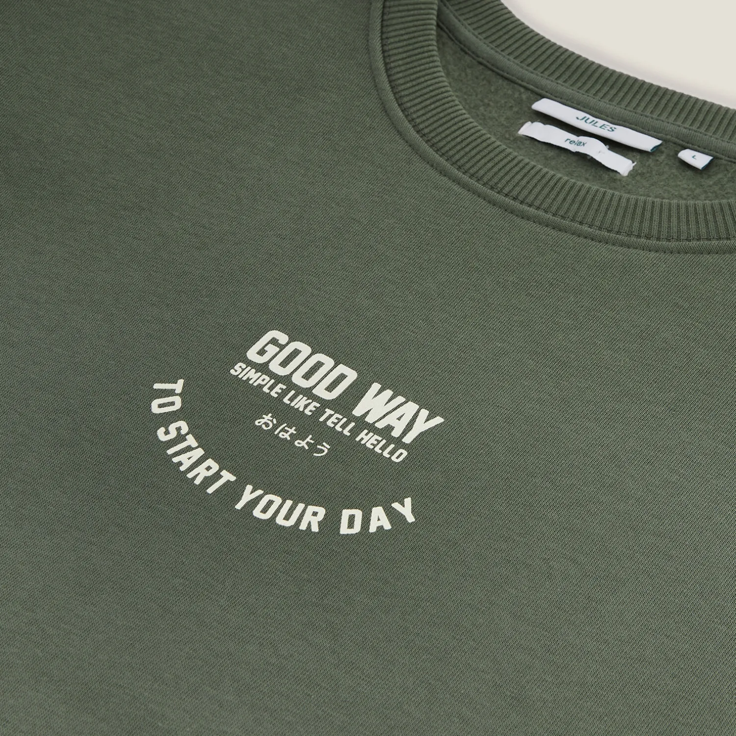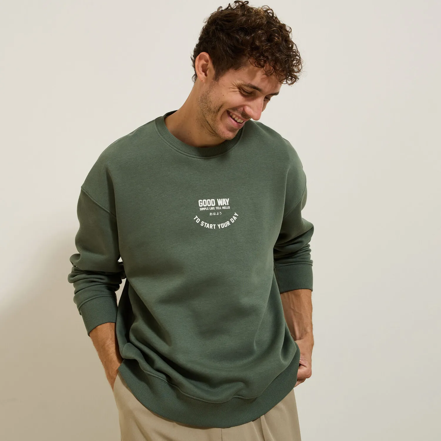 Ce sweat à l’imprimé original se marie parfaitement avec un pantalon chino clair pour un look décontracté et tendance. Complétez la tenue avec une paire de baskets blanches pour un style urbain et confortable.