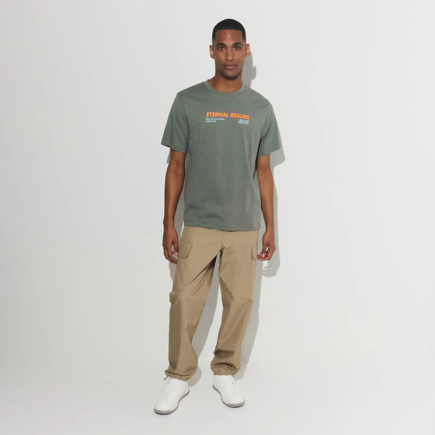 Ce t-shirt imprimé se marie parfaitement avec un pantalon cargo noir pour un look décontracté et tendance. Vous pouvez compléter la tenue avec une casquette noire et des baskets blanches pour un style urbain et moderne.