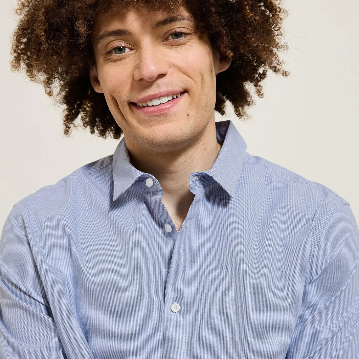 Cette chemise en coton à petits carreaux est une pièce indispensable dans le dressing masculin ! Elle s’accorde parfaitement avec un pantalon chino ou un jean.