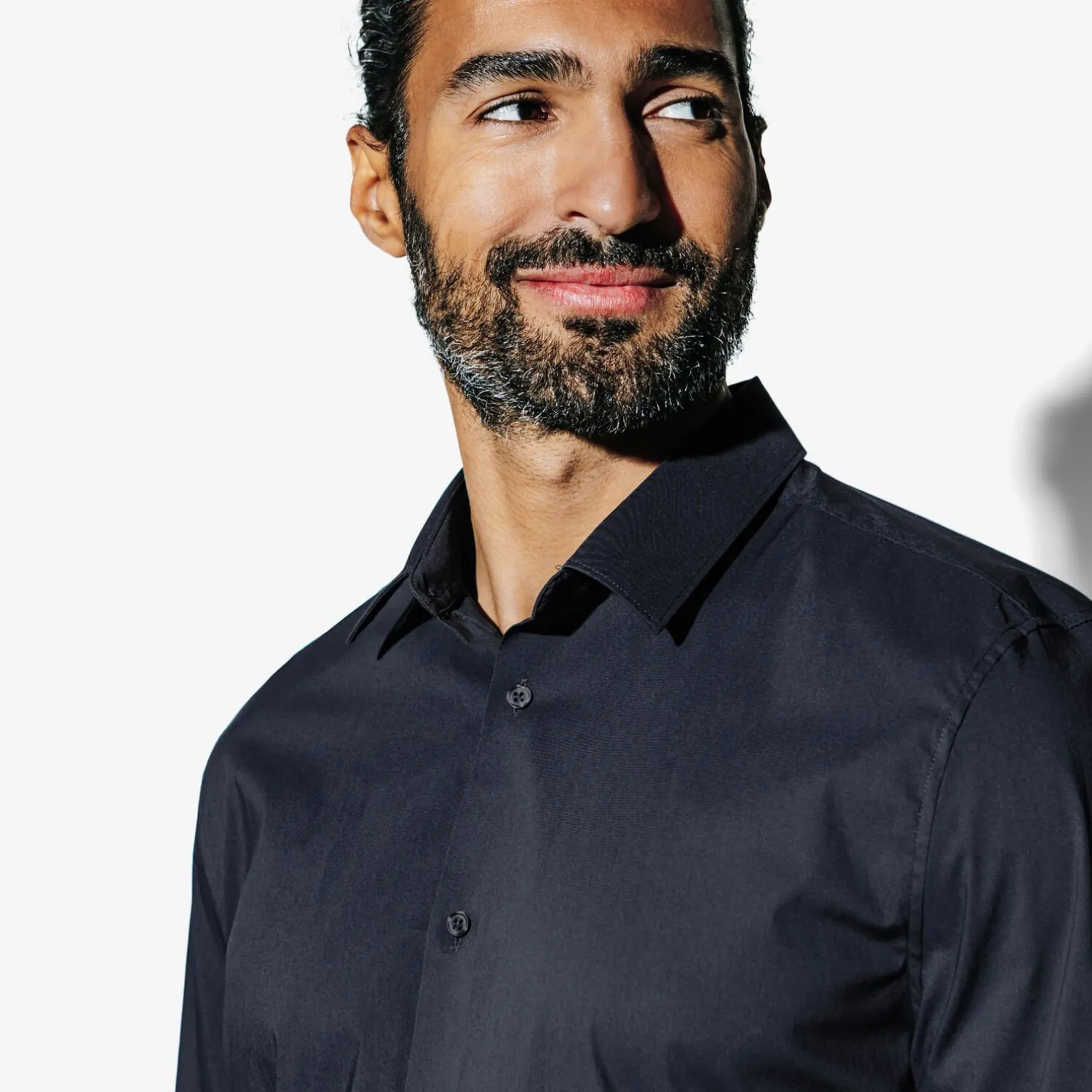 Cette chemise à manches longues s’associe aisément avec un chino ou un pantalon de costume.