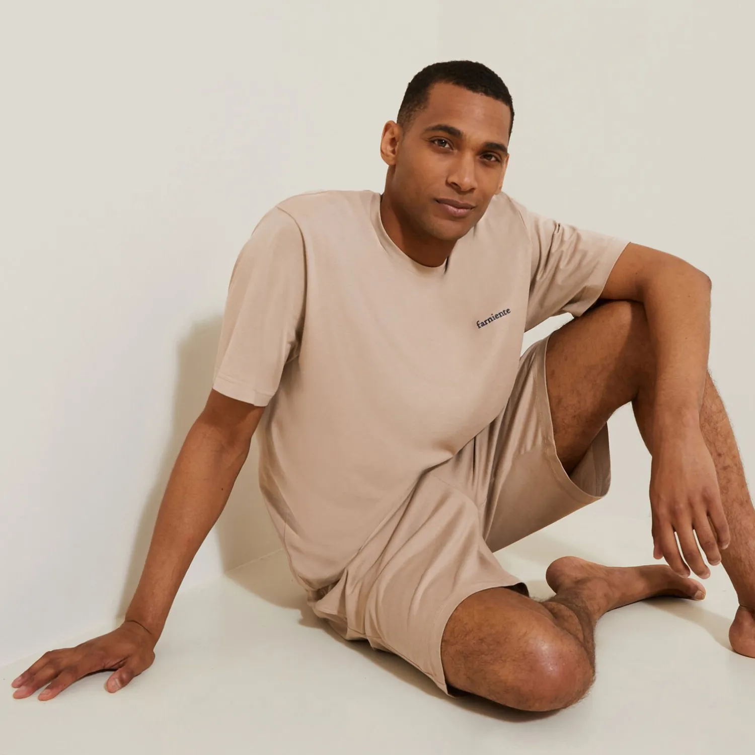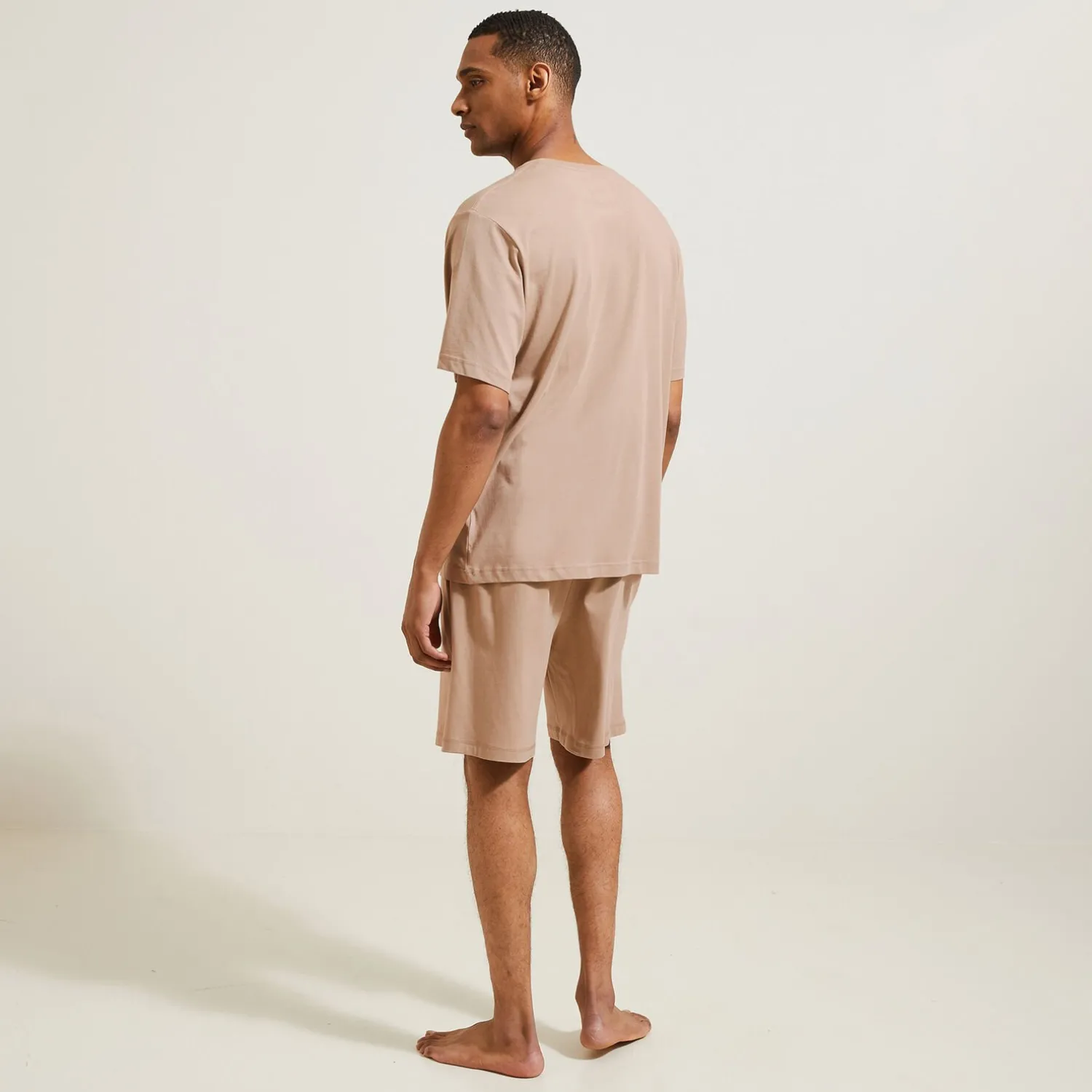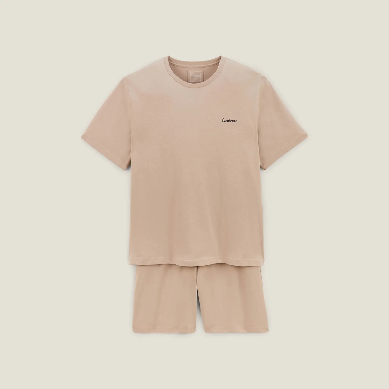 Ce pyjama est formé d’un ensemble comprenant un short uni à la taille élastiquée ainsi que d’un t-shirt uni à manches courtes.