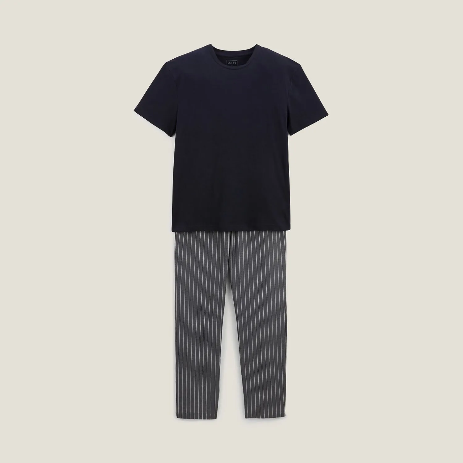Ce pyjama est composé d’un t-shirt à manches courtes et d’un pantalon en tissu rayé. L’ensemble est confortable en toutes circonstances.
