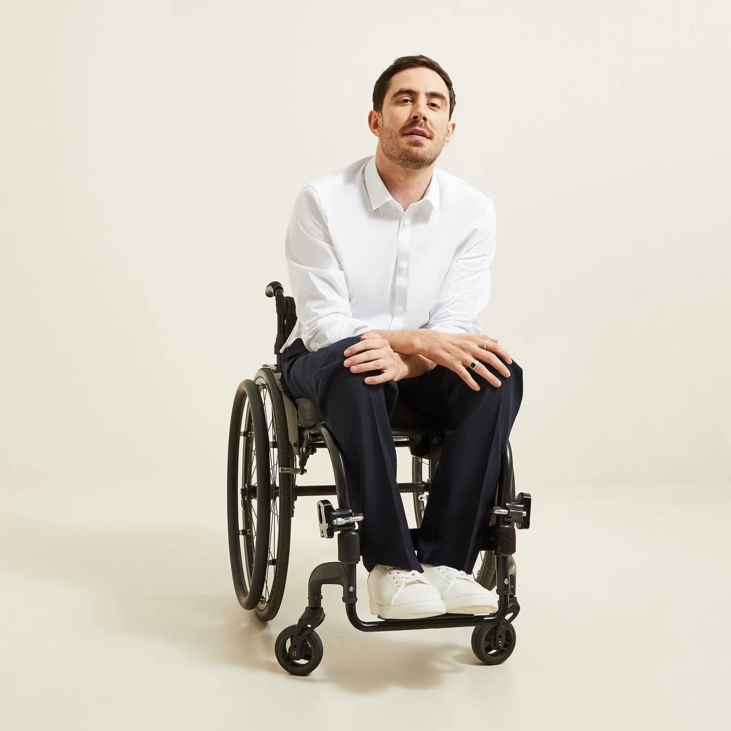 Ce pantalon de costume, parfait pour les cérémonies de mariage, est spécialement conçu pour les personnes à mobilité réduite.