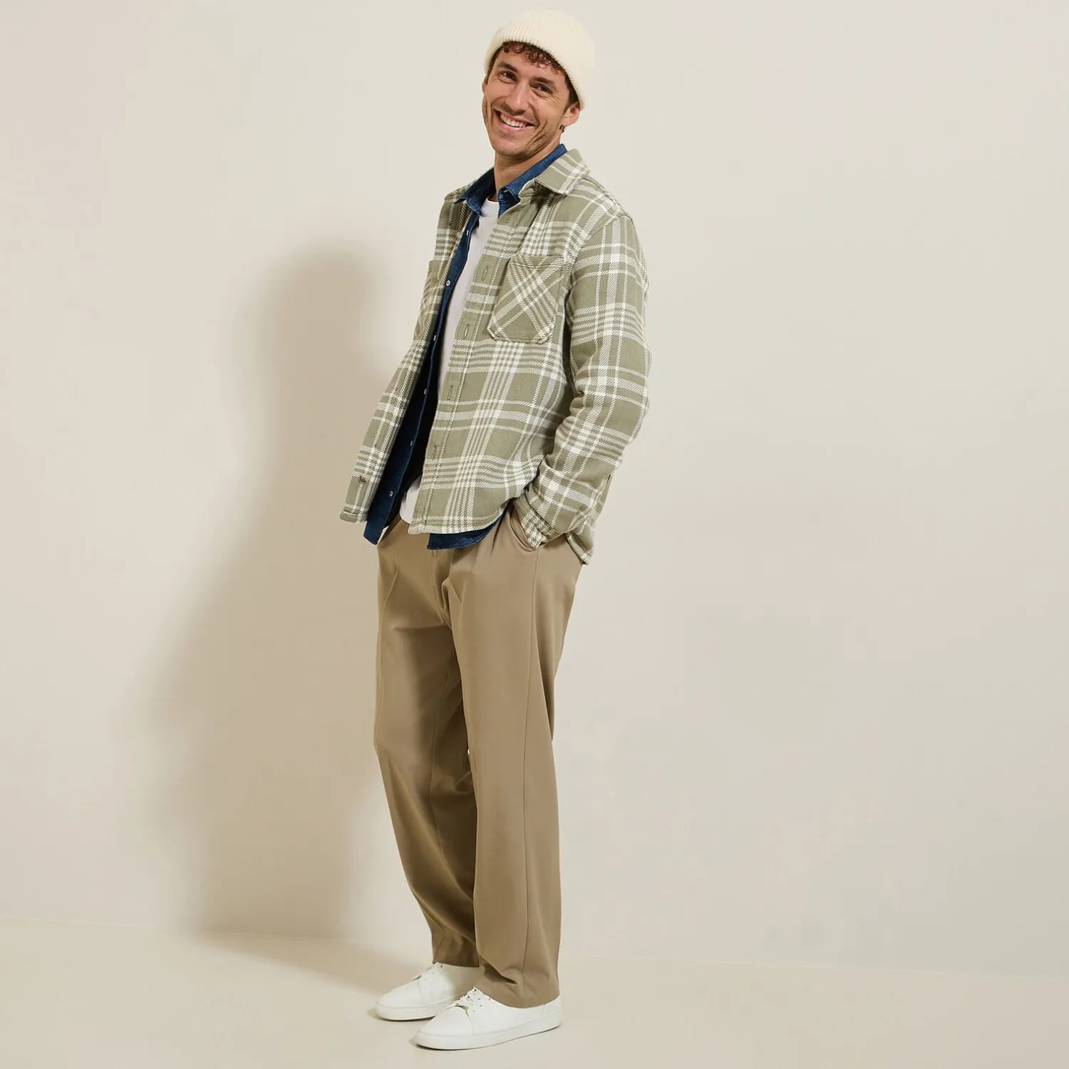 Cette chemise à carreaux se marie parfaitement avec un t-shirt blanc uni, un pantalon chino beige et des baskets blanches pour un look décontracté.