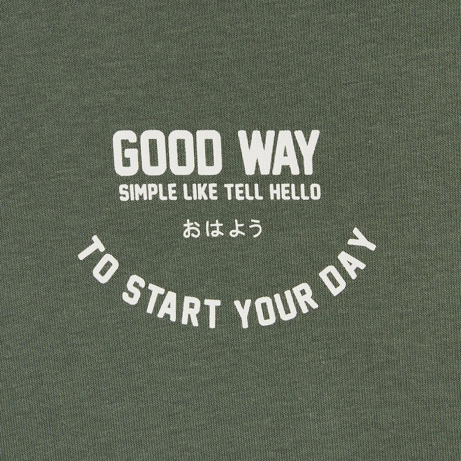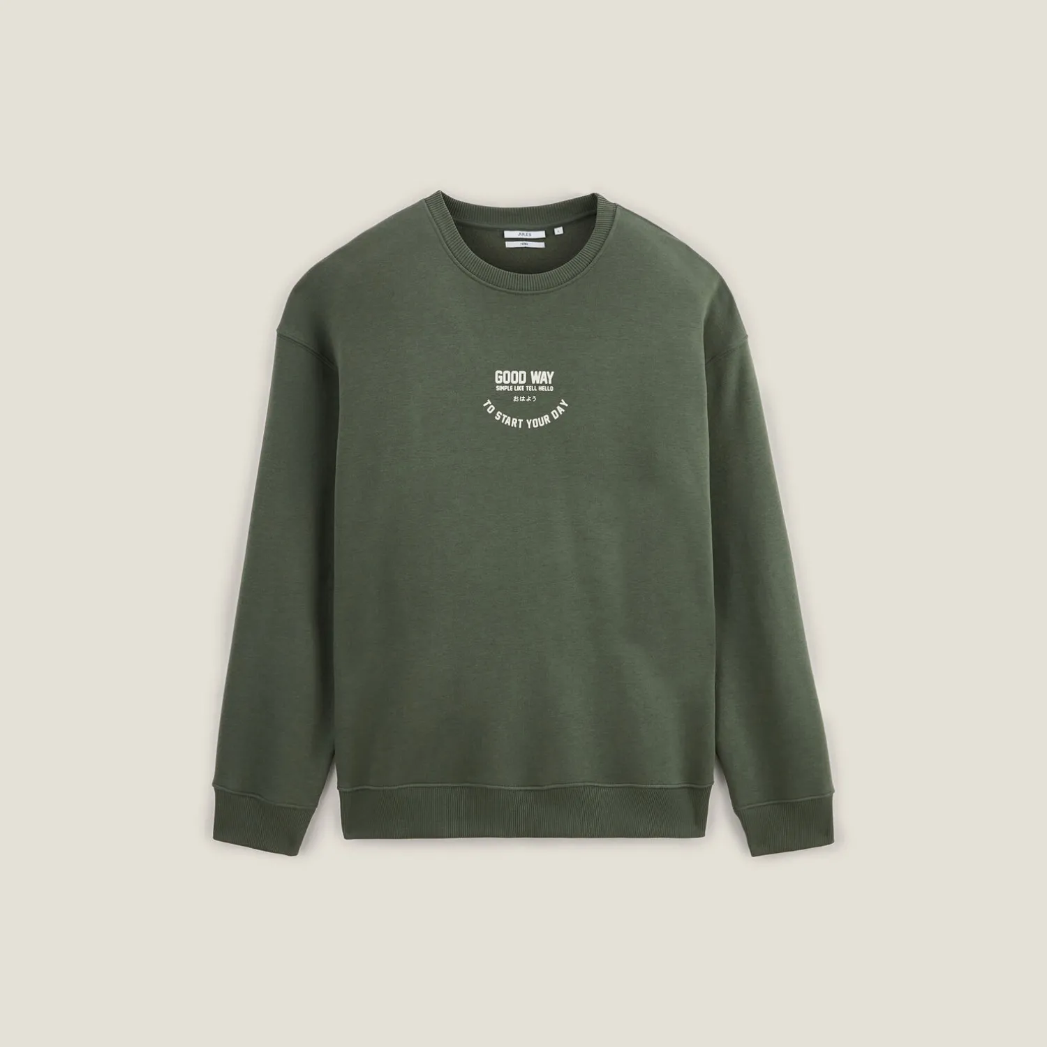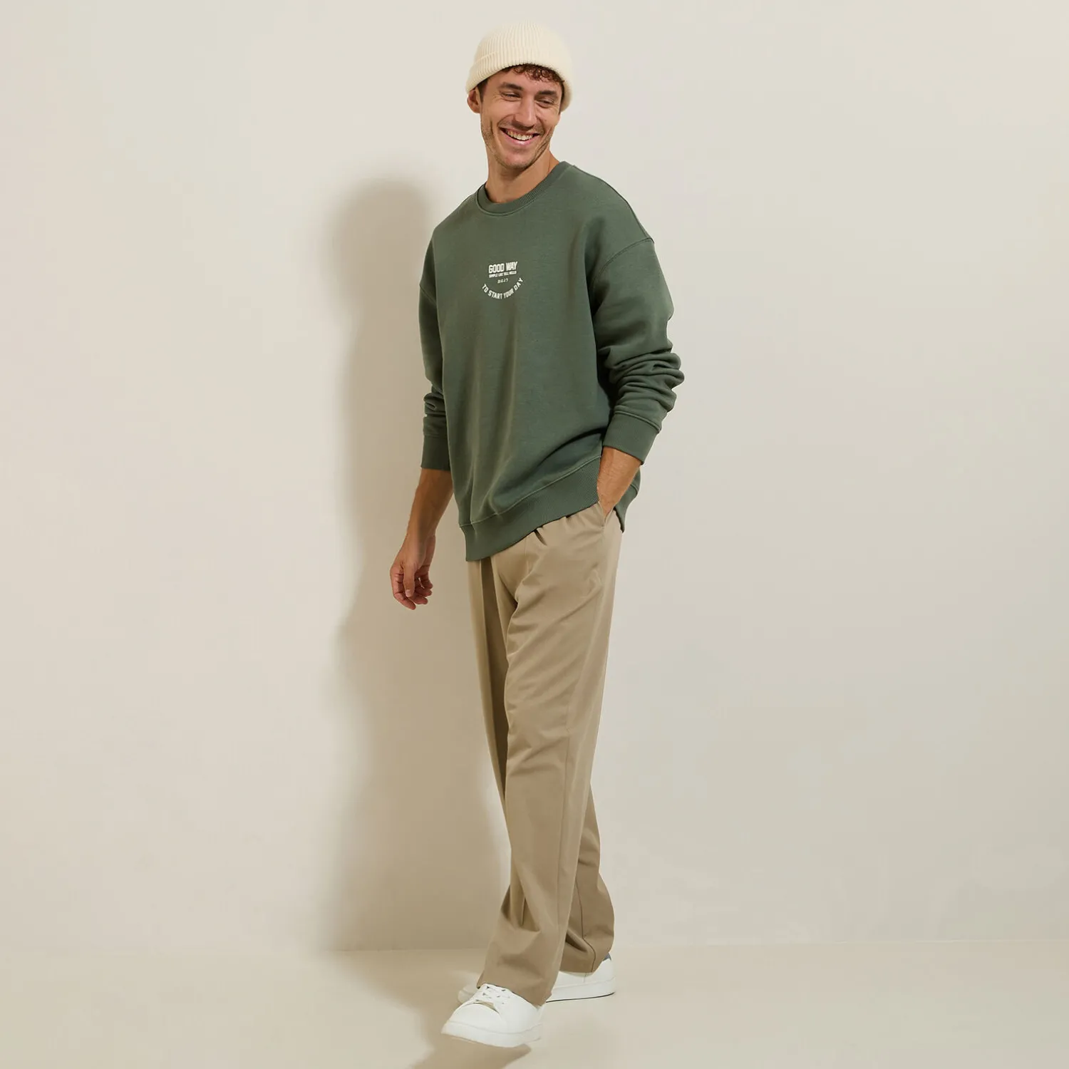Ce sweat à l’imprimé original se marie parfaitement avec un pantalon chino clair pour un look décontracté et tendance. Complétez la tenue avec une paire de baskets blanches pour un style urbain et confortable.