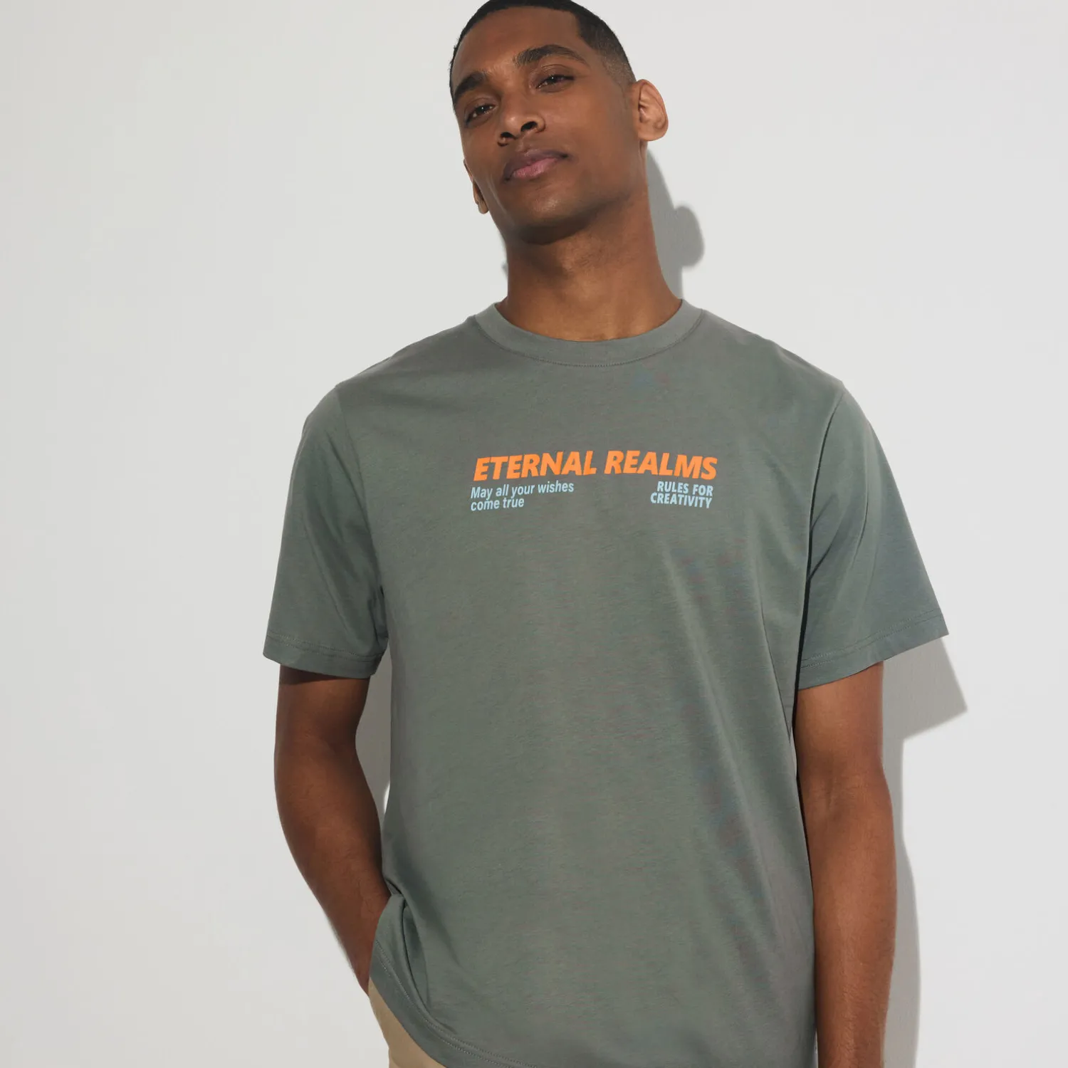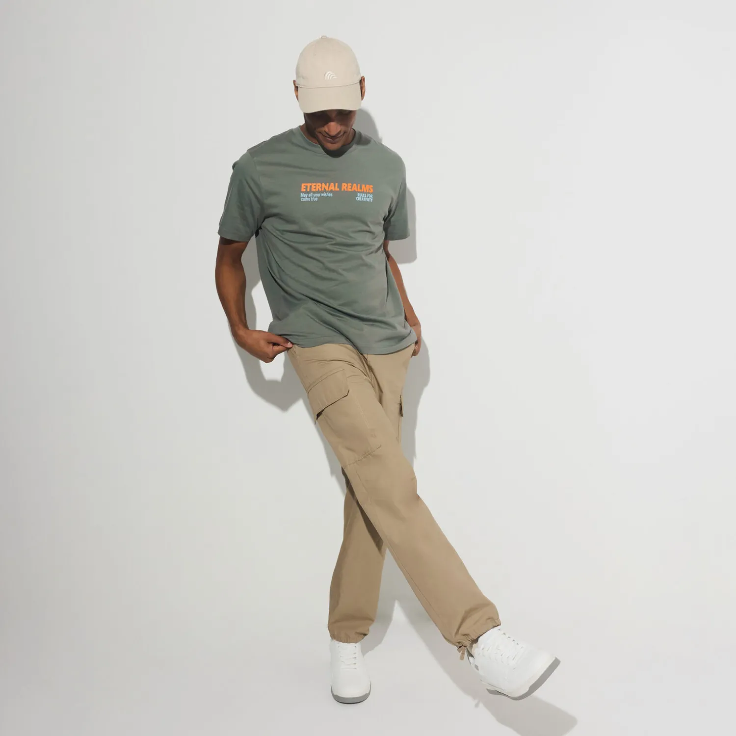 Ce t-shirt imprimé se marie parfaitement avec un pantalon cargo noir pour un look décontracté et tendance. Vous pouvez compléter la tenue avec une casquette noire et des baskets blanches pour un style urbain et moderne.