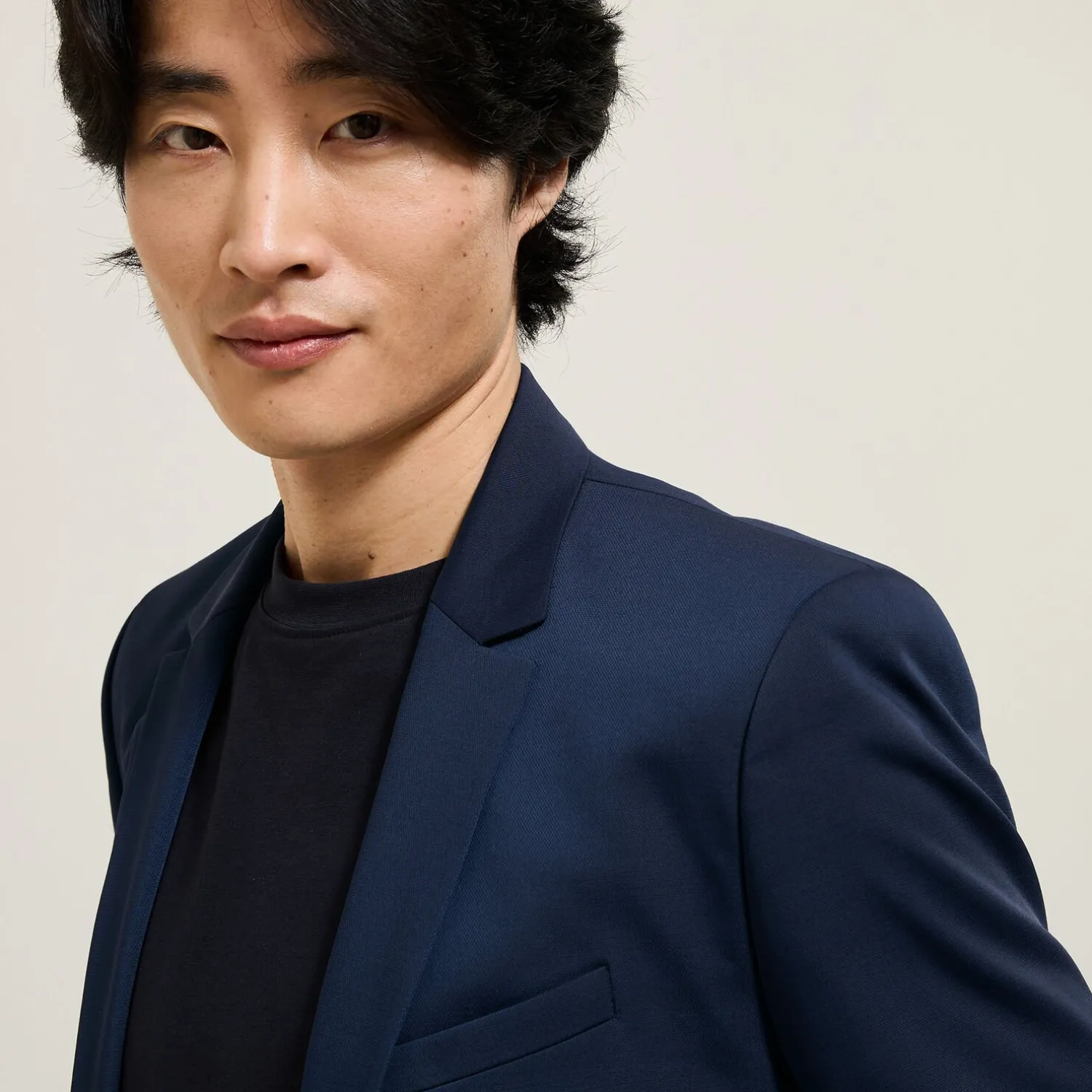 Ce blazer présente une coupe ajustée, deux boutons et des revers classiques. Il est entièrement doublé et possède deux poches à rabat sur les côtés, ainsi qu’une poche poitrine.